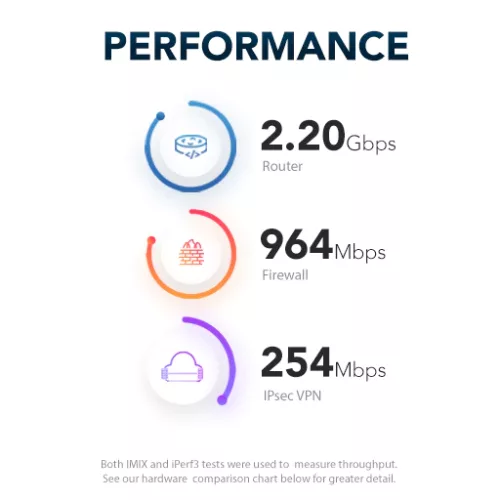 Throughput: IMIX: 250 Mb/s Firewall, 90 Mb/s IPSec.